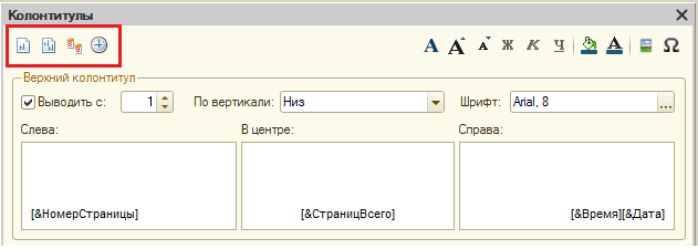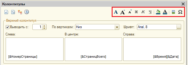 В многострочных полях «Колонтитула» можно указать текст, который будет помещен в колонтитул (можно заметить, что поля разделены по горизонтальному выравниванию текста). С помощью кнопок сверху можно указать какие конструкции будут выводится на колонтитулах, такие как:
