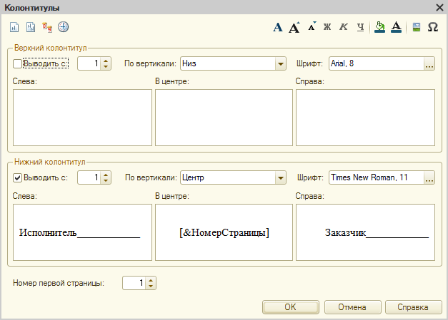 В 1С печатной форме возможны два основных типа колонтитулов: