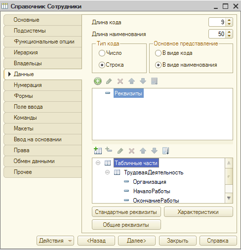 Табличные части Таблицы с данными (например, "Комплектующие" для номенклатуры).