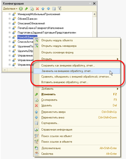 Конфигуратор поддерживает также возможность сравнения и объединения существующей в конфигурации обработки или отчета с внешней обработкой и отчетом, а также сравнение и объединение двух внешних отчетов или обработок.