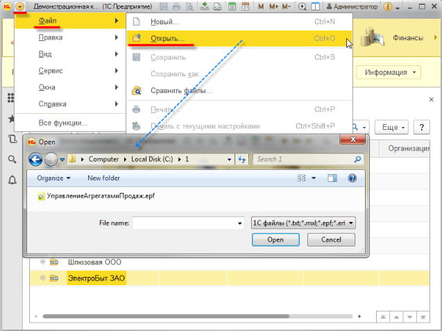 В режиме 1С:Предприятие внешнюю обработку можно запустить на выполнение, открыв ее как любой другой файл, хранящийся на диске. Такая обработка будет работать точно так же, как если бы она входила в состав прикладного решения.