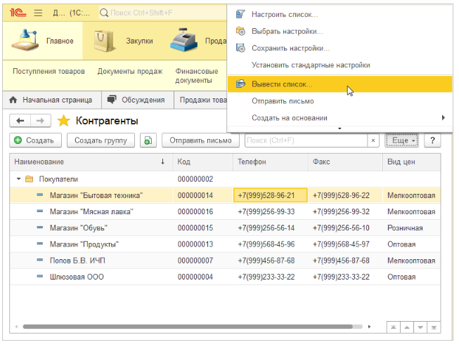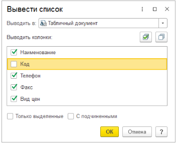 Вывод списков — это одна из стандартных интерфейсных возможностей. Она предоставляется платформой и доступна пользователям любых прикладных решений. С её помощью можно вывести список в табличный или текстовый документ, а затем этот документ вывести на печать или сохранить его в файле на диске. При выводе списка учитывается текущая настройка колонок, отбор и сортировка.