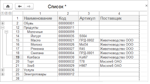 При выводе списка в табличный документ автоматически создаются группировки, если список иерархический. Например, список справочника Номенклатура, выведенный в табличный документ, будет выглядеть следующим образом: