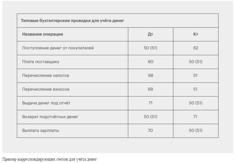 Например, получение наличных денег от покупателей отражают по дебету счёта 50 «Касса» и кредиту счёта 62 «Расчёты с покупателями и заказчиками». А получение материалов от поставщика — по дебету счёта 10 «Материалы» и кредиту счёта 60 «Расчёты с поставщиками и подрядчиками».