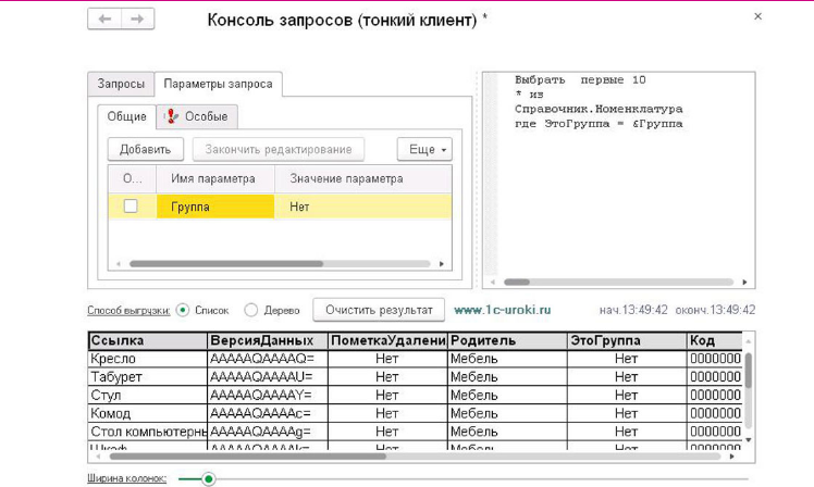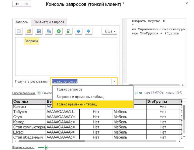 - Непосредственно запрос. В толстом клиенте можно прибегнуть к конструктору запросов платформы 1С.