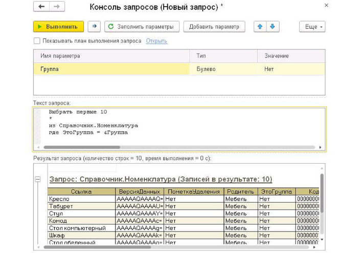 Чтобы отладить и оптимизировать запросы на языке 1С, программисту нужно вставить текст в соответствующий раздел, вписать параметры и проверить результат работы. Для заполнения параметров нужно отыскать соответствующую вкладку либо раздел. Запуск происходит при нажатии кнопки «Выполнить» или клавиши «F7». В консоли отражается не только перечень полей, но и время выполнения запроса, а также число строк, выведенных в соответствующий раздел.