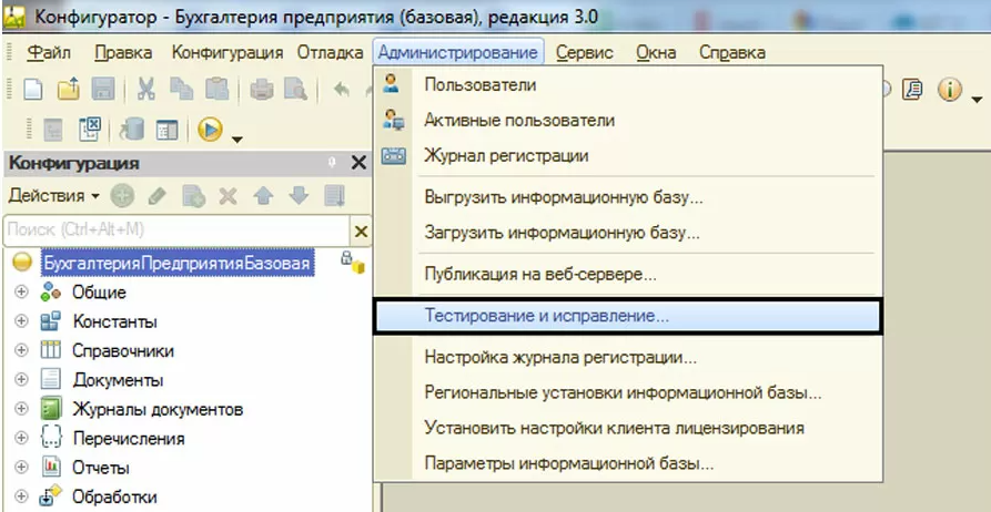 Для тестирования и исправления информационной базы запустим программу в режиме «Конфигуратор». В пункте меню «Администрирование» выберем «Тестирование и исправление...».