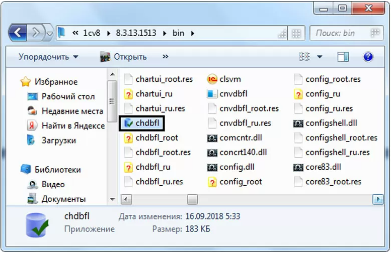 Файл утилиты chdbfl.exe находится в папке bin, установленной платформы 1С – обычно в папке Program Files (х86)-1cv8, а далее папка с релизом платформы.