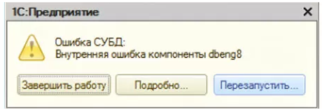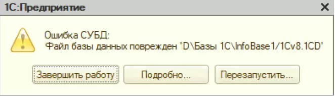 Например, «Ошибка СУБД: Файл базы данных поврежден» решается тестированием и исправлением файла информационной базы.