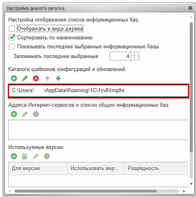 Посмотреть, где располагаются временные файлы программы, можно в кнопке «Настройка...» в окне запуска 1С. В поле «Каталоги шаблонов и конфигурация» видно, в какой папке располагаются временные файлы. В нашем примере в папке пользователя, далее в папке AppData\Roaming\1C\tmplts.