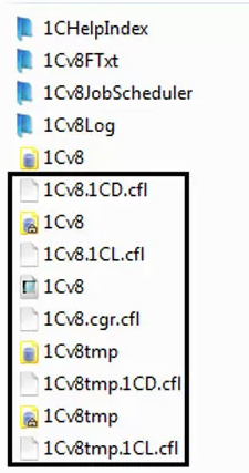 Устранение ошибки. В папке с установленной программой, кроме файла с информационной базой, имеются служебные временные файлы. При аварийном выключении программы также могут сохраниться файлы блокировок (которые автоматически должны были удалиться при выключении программы). Один из вариантов решения проблемы – это удаление из этой папки всех этих файлов. Такие файлы будут сформированы вновь при запуске программы, поэтому их можно смело удалить. Файл 1Cv8.1CD – файл информационной базы. Его удалять нельзя.