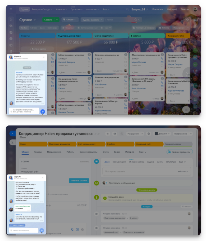 - Будет всегда под рукой — виджет с Мартой AI доступен в любом разделе Битрикс24.