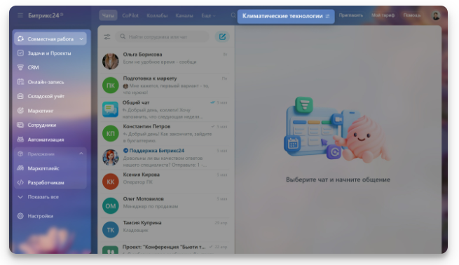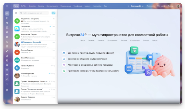 Для компаний, у которых Совместная работа — главный инструмент, мессенджер становится центральным разделом.