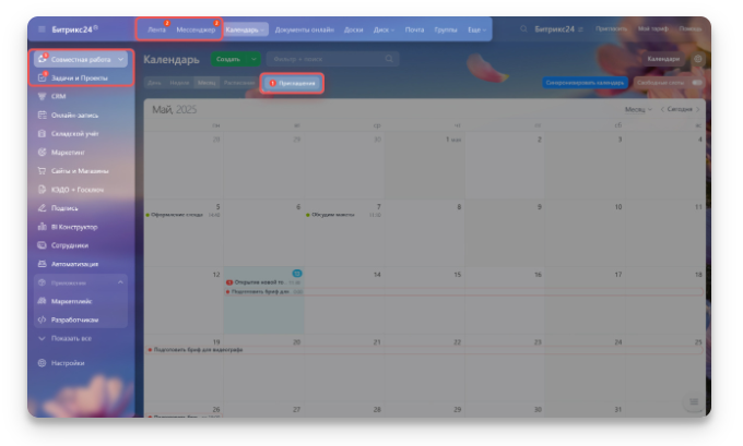 - Основное меню — в левой части. Здесь собраны все разделы: совместная работа, задачи и проекты, CRM, календарь и другие.