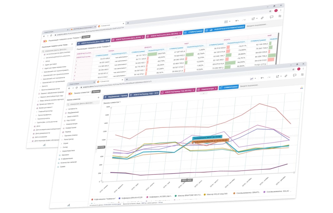 Эти возможности доступны как в базовых конфигурациях 1С (например, 1С:Управление торговлей, 1С:ERP), так и в интеграции с BI-платформами (Power BI, Qlik, Tableau).