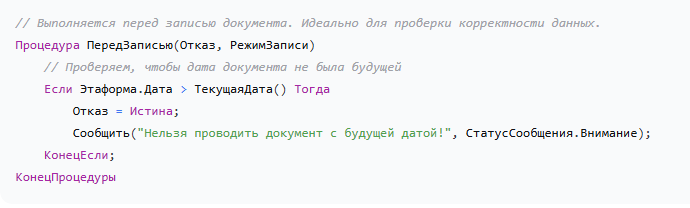 ПередЗаписью(Отказ, РежимЗаписи): Главное событие для контроля данных и сложных расчетов до записи в базу. -