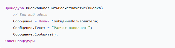 Для реакции на событие создается обработчик события — это специальная процедура на встроенном языке 1С, которая выполняется в момент наступления события.