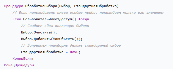 ОбработкаВыбора(Выбор, СтандартнаяОбработка): Позволяет изменить поведение выбора элемента в форме выбора. -