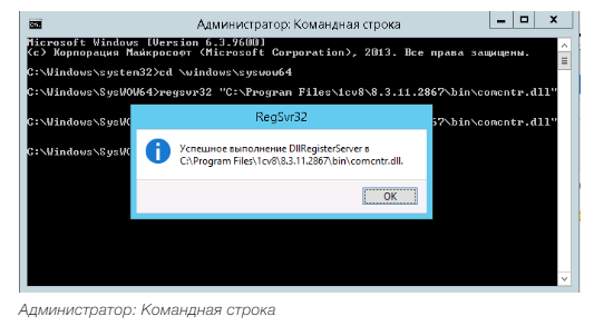 Для того чтобы выполнить команду, достаточно будет в строке написать такой текст команды «regsvr32 "C:\Program Files\1cv8\8.3.ХХ.ХХХХ\bin\comcntr.dll"». Вместо «ХХ.ХХХХ» необходимо указать необходимый релиз платформы, библиотеку которой, необходимо зарегистрировать в реестре системы.