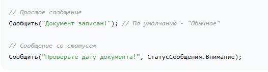 Это перечисление используется при выводе сообщений пользователю через Сообщить() или Предупреждение(). Оно определяет иконку и поведение сообщения.